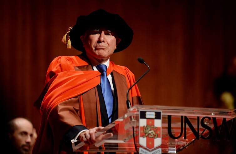 John Howard receives an honorary degree at the University of New South Wales. Howard replaced the single course fee under HECS with differential course fees for different subjects.