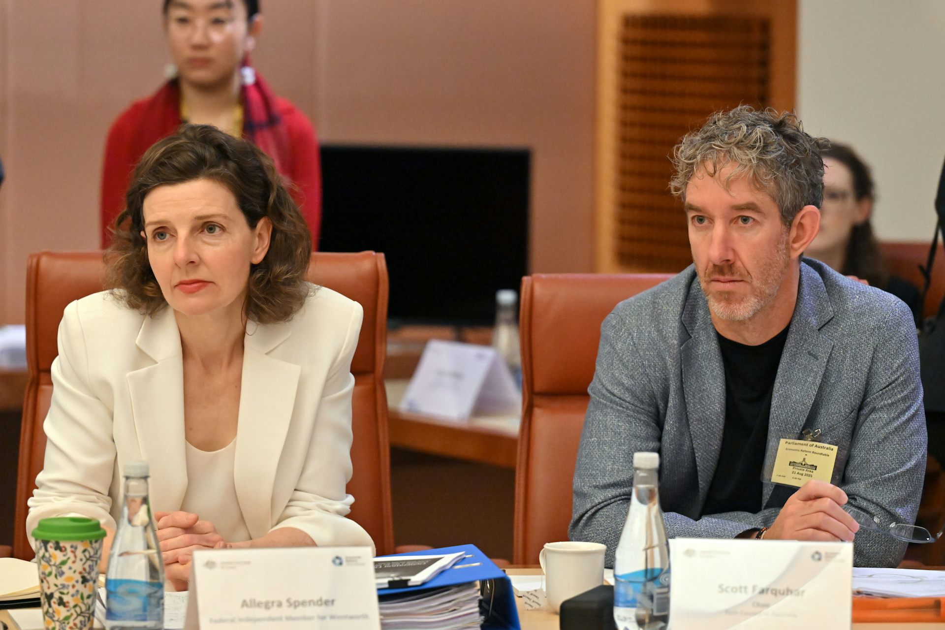 Independent member for Wentworth Allegra Spender and Co-founder of Atlassian Scott Farquhar during an Economic Reform Roundtable in the Cabinet Room at Parliament House, in Canberra on Thursday, August 21, 2025.