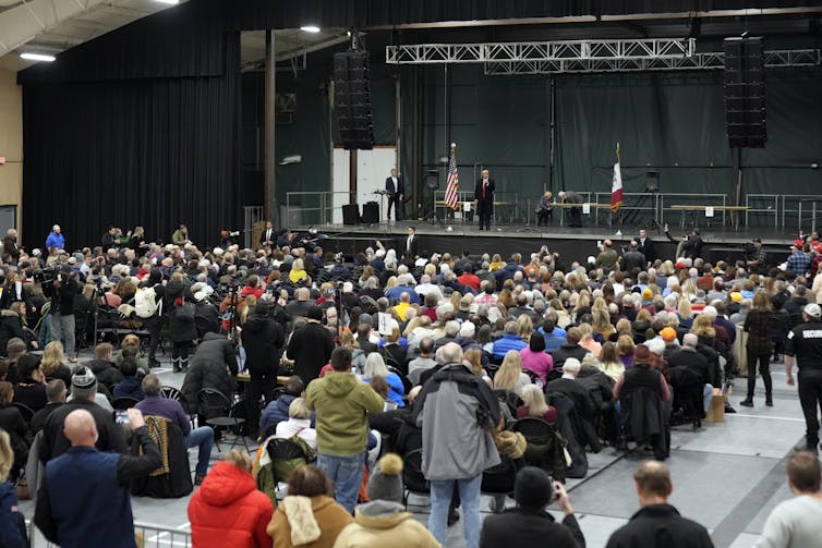 Caucus goers listen as former President Donald Trump speaks at a caucus site in Clive, Iowa.